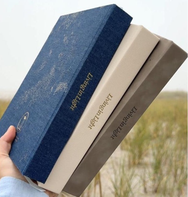 Choose from greige leather, ivory leather, or denim covers, each wrapped around durable 100 GSM cream-colored pages that stand up to daily use.